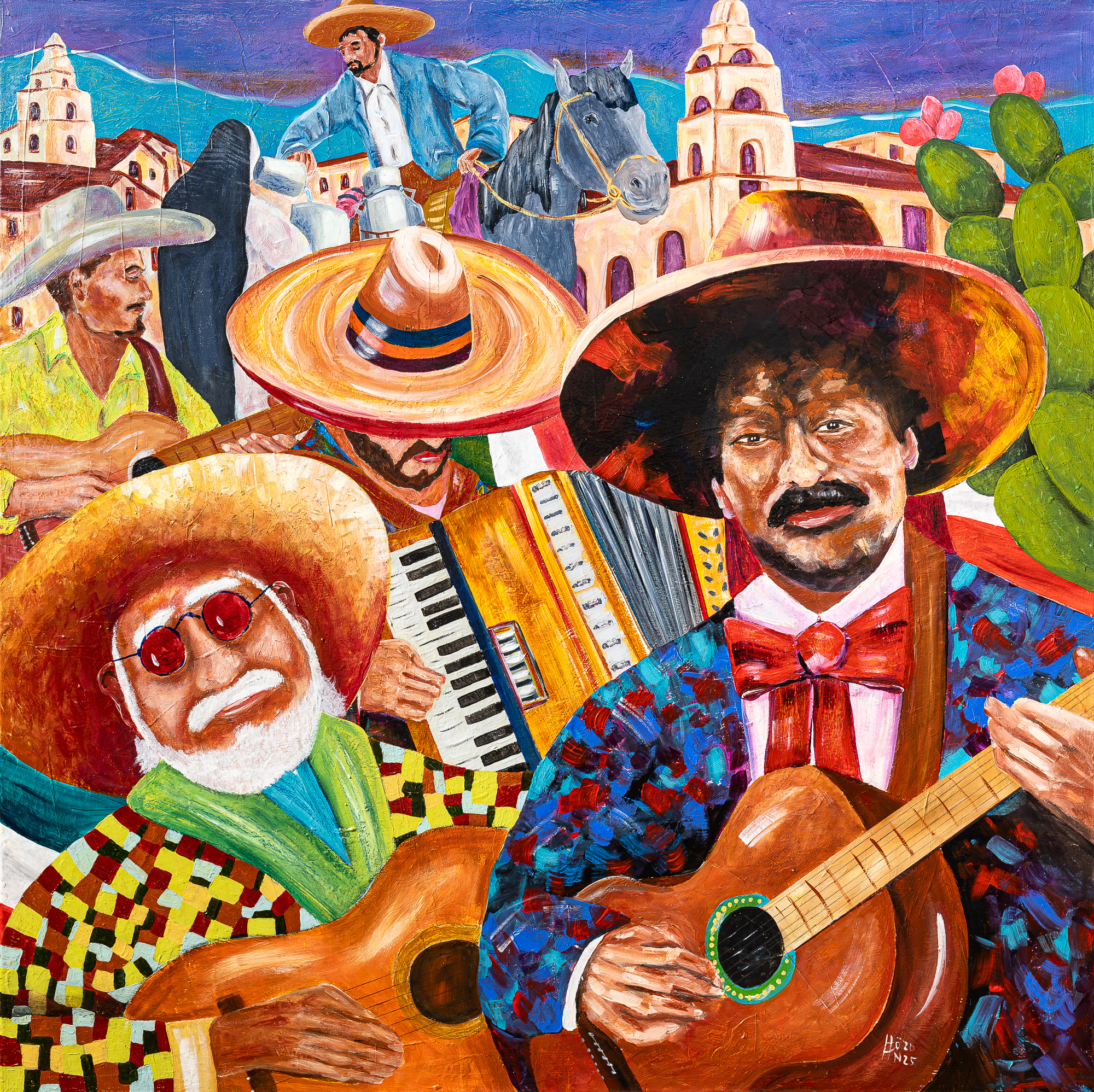 Aus seinem vielseitigen und beeindruckenden bisherigen Werk hier der Ausschnitt einer 2017 begonnenen Serie von Porträts namhafter Persönlichkeiten, vornehmlich aus der Musikszene, die nach wie vor fortgesetzt wird. Zwischenzeitlich wurde die umfangreiche Werkreihe um beeindruckende szenische Darstellungen von Menschen und auch Tieren erweitert. Alle Gemälde entstanden in Acryl/Dispersion (vereinzelt in Kombination mit Pastell, Kohle und Collage) auf Leinwand.